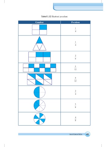 Tabel 1.12 Ilustrasi pecahan Gambar Pecahan 1 4 1 4 2 6 5 12 4 12 2 4 3 8 4 8 MATEMATIKA 41