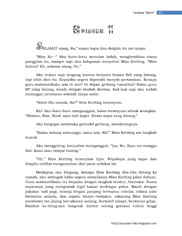 ”Boleh Ibu masuk, Ra?” Miss Keriting tersenyum.