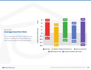 EDUCATION Average Cost Per Click The average cost per click (CPC) in AdWords across verticals in the education industry is $2.40 on the search network and $0.47 on the display network. GOOGLE ADWORDS INDUSTRY BENCHMARKS 2018 | 29