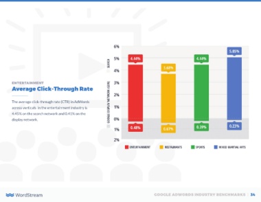ENTERTAINMENT Average Click-Through Rate The average click-through rate (CTR) in AdWords across verticals in the entertainment industry is 4.45% on the search network and 0.41% on the display network. GOOGLE ADWORDS INDUSTRY BENCHMARKS | 34