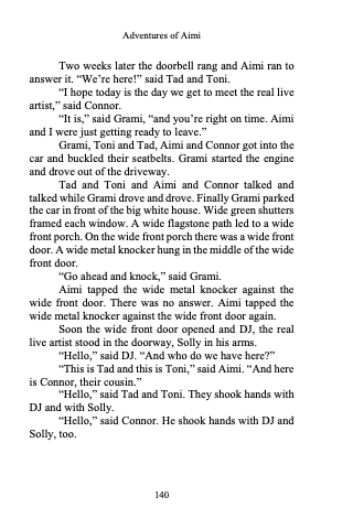 Tad and Toni and Aimi and Connor talked and talked while Grami drove and drove. Finally Grami parked the car in front of the big white house. Wide green shutters framed each window. A wide flagstone path led to a wide front porch. On the wide front porch there was a wide front door. A wide metal knocker hung in the middle of the wide front door.