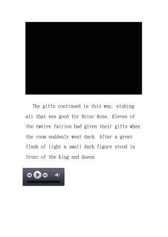 The gifts continued in this way, wishing all that was good for Briar Rose. Eleven of the twelve fairies had given their gifts when the room suddenly went dark. After a great flash of light a small dark figure stood in front of the King and Queen.