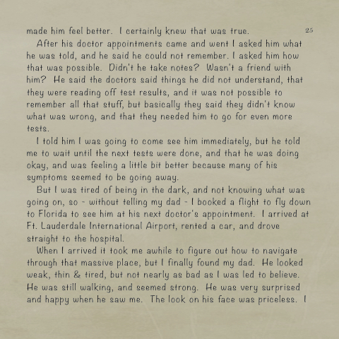 But I was tired of being in the dark, and not knowing what was going on, so ‐ without telling my dad ‐ I booked a flight to fly down to Florida to see him at his next doctor's appointment. I arrived at Ft. Lauderdale International Airport, rented a car, and drove straight to the hospital.
