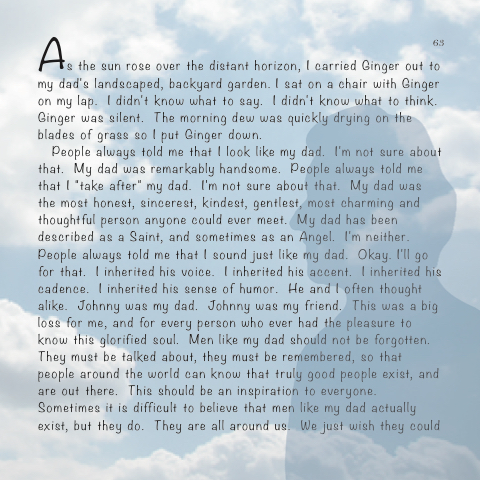 As the sun rose over the distant horizon, I carried Ginger out to my dad's landscaped, backyard garden. I sat on a chair with Ginger on my lap. I didn't know what to say. I didn't know what to think. Ginger was silent. The morning dew was quickly drying on the blades of grass so I put Ginger down.