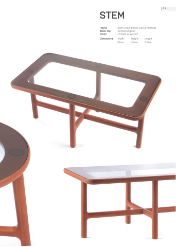 69 STEM Frame solid wood (beech, oak or walnut) Table top tempered glass Finish stained or waxed Dimensions Width Height Lenght 700mm 450mm 1200mm