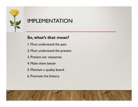 IMPLEMENTATION So, what’s that mean? 1. Must understand the past 2. Must understand the present 3. Protect our resources 4. Make them better 5. Maintain a quality board 6. Promote the history