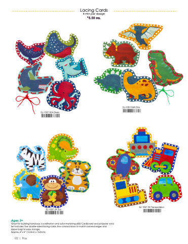 Great for building hand-eye coordination and color-matching skills! Cardboard and polyester cord. Set includes: five double-sided lacing cards, five colored laces to match colored edges and
