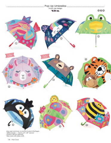 PNC 3 2 1 8 7 6 11 Easy open and close, no buttons to pinch little fingers. 100% polyester. | Approx. 23” x 28” opened (55.8cm x 68.5cm opened). Wipe clean with damp cloth. 12 13 38 | Rain Gear Pop Up Umbrellas 4 min. per design $8.50 ea.