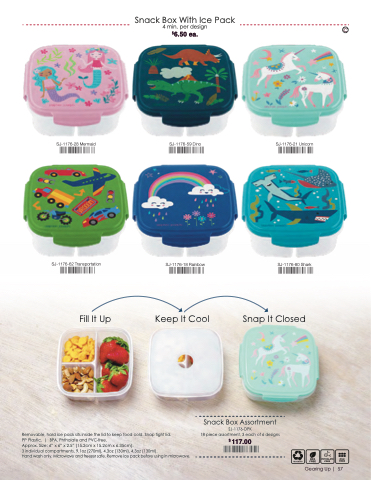 Removable, hard ice pack sits inside the lid to keep food cold. Snap tight lid. PP Plastic. | BPA, Phthalate and PVC-free.