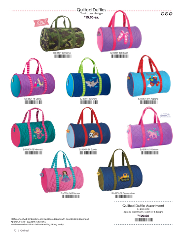 100% cotton twill. Embroidery and appliqué designs with coordinating zipper pull. Approx. 9”x 15” (22.8cm x 38.1cm).