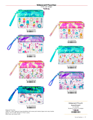 100% PVC. Clear, iridescent bag embellished with screen-print details. Zipper and carry handle. Approx. 10”x 7”x 5/8” (25.4cm x 17.9cm 1.6cm).