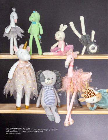 7 10 8 9 100% Polyester exclusive of decorations. Large doll approx. 16” x 5” x 4” (12.7cm x 10.16cm x 40.64cm) Sitting height approx. 9” Small doll approx. 11” x 2.5” x 2.5” (25.4cm x 6.35cm x 6.35cm) Spot clean only, air dry. 6 | Baby 1 4 2 5