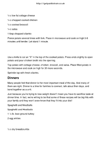Top potato with cottage cheese, chicken, broccoli, and salsa. Place filled potato in