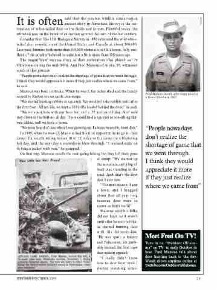 Tune in to “Outdoor Oklaho- ma” on TV in early October to hear Fred Manous talk about deer hunting back in the day. Watch shows anytime online at youtube.com/OutdoorOklahoma.