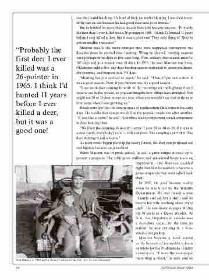 Manous recalls the many changes that have happened throughout the decades since he started deer hunting. When he started, hunting seasons were perhaps three days or five days long. Now, archery deer season runs for 107 days and gun season runs 16 days. In 1936, the year Manous was born, Oklahoma held a five-day deer hunting season restricted to seven southeast- ern counties, and hunters took 375 deer.