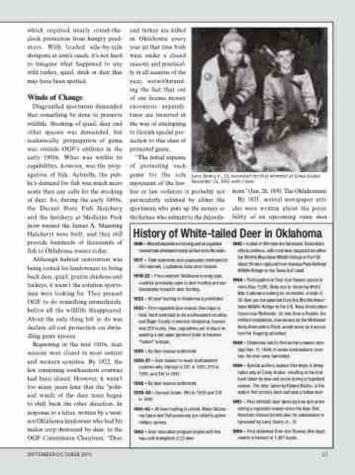 Although habitat restoration was being touted for landowners to bring back deer, quail, prairie chickens and turkeys, it wasn’t the solution sports- men were looking for. They pressed OGF to do something immediately, before all the wildlife disappeared. About the only thing left to do was declare all-out protection on dwin- dling game species.