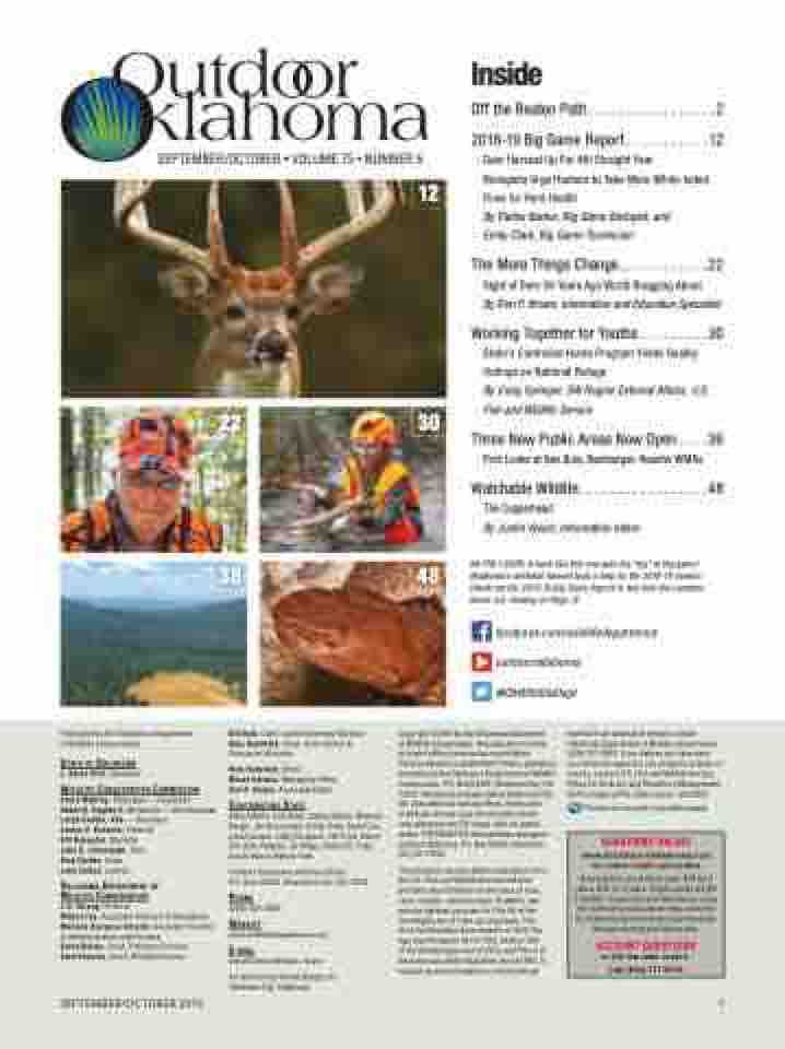ON THE COVER: A buck like this one puts the “big” in big game! Oklahoma’s whitetail harvest took a leap for the 2018-19 season. Check out the 2018-19 Big Game Report to see how the numbers shook out, starting on Page 12.