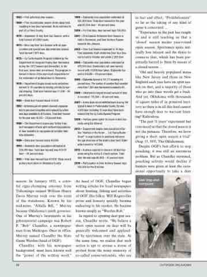 season. In January 1932, a color- ful cigar-chomping attorney from Tishomingo named William Henry Davis Murray took over the reins of the statehouse. Known by his nickname, “Alfalfa Bill, ” Murray became Oklahoma’s ninth governor. One of Murray’s lieutenants in his gubernatorial campaign was Robert P. “Bob” Chandler, a newspaper- man from Muskogee. Once in office, Murray named Chandler the State Game Warden (head of OGF).