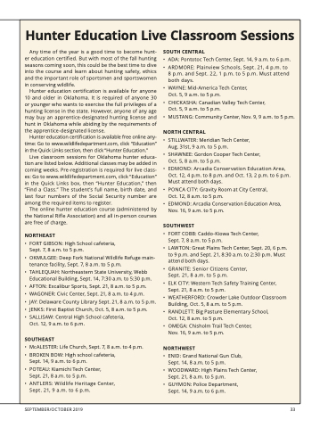 Live classroom sessions for Oklahoma hunter educa- tion are listed below. Additional classes may be added in coming weeks. Pre-registration is required for live class- es: Go to www.wildlifedepartment.com, click “Education” in the Quick Links box, then “Hunter Education,” then “Find a Class.” The student’s full name, birth date, and last four numbers of the Social Security number are among the required items to register.