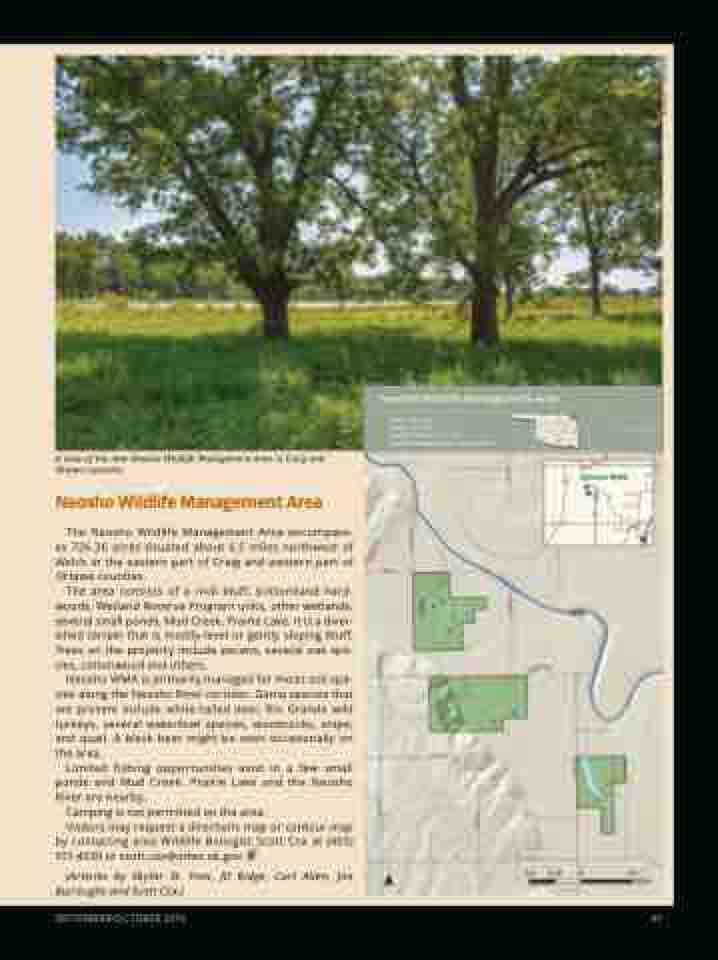 The Neosho Wildlife Management Area encompass- es 726.36 acres situated about 6.5 miles northwest of Welch in the eastern part of Craig and western part of Ottawa counties.