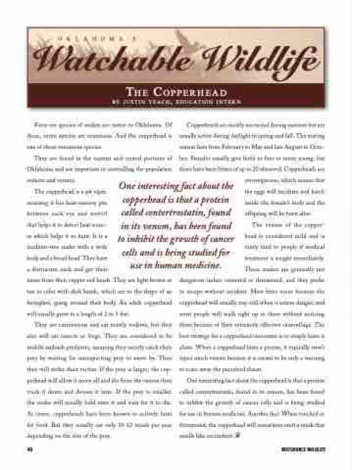Forty-six species of snakes are native to Oklahoma. Of those, seven species are venomous. And the copperhead is one of those venomous species.