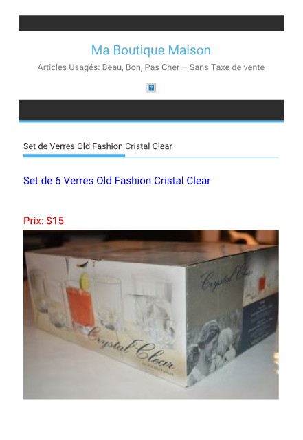 Ma Boutique Maison Articles Usagés: Beau, Bon, Pas Cher – Sans Taxe de vente Set de Verres Old Fashion Cristal Clear Set de 6 Verres Old Fashion Cristal Clear Prix: $15