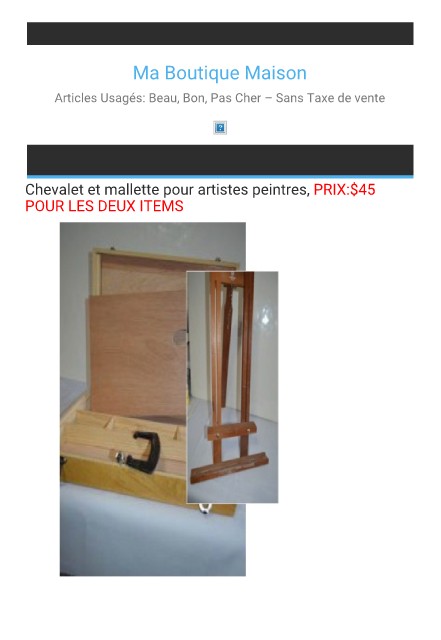Ma Boutique Maison Articles Usagés: Beau, Bon, Pas Cher – Sans Taxe de vente Chevalet et mallette pour artistes peintres, PRIX:$45 POUR LES DEUX ITEMS