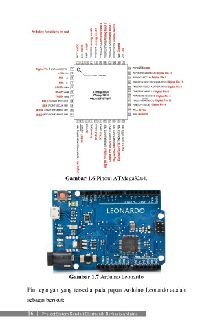 Gambar 1.6 Pinout ATMega32u4. Gambar 1.7 Arduino Leonardo Pin tegangan yang tersedia pada papan Arduino Leonardo adalah sebagai berikut: 16 | Project Sistem Kendali Elektronik Berbasis Arduino
