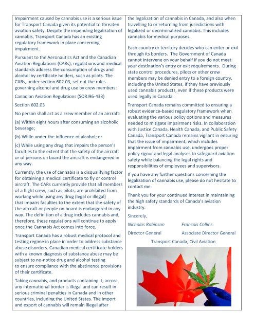 aviation safety. Despite the impending legalization of legalized or decriminalized cannabis. This includes