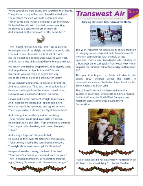 He stepped out of the sleigh, but before he could talk, This year Transwest Air continues its annual tradition