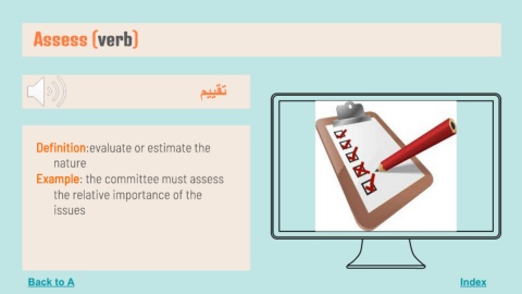 Assess (verb) ﺗﻘﯿﯿﻢ Definition:evaluate or estimate the nature Example: the committee must assess the relative importance of the issues Back to A Index