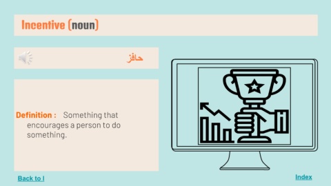 Incentive (noun) ﺣﺎﻓﺰ Definition : Something that Index encourages a person to do something. Back to I