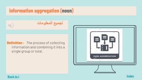 information aggregation (noun) Index ﺗﺠﻤﯿﻊ اﻟﻤﻌﻠﻮﻣﺎت Definition : The process of collecting information and combining it into a single group or total. Back to I
