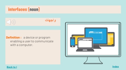 interfaces (noun) Index واﺟﮭﺎت Definition : a device or program enabling a user to communicate with a computer. Back to I