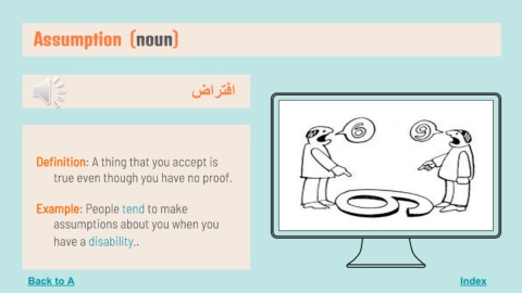 Assumption (noun) Index اﻓﺘﺮاض Definition: A thing that you accept is true even though you have no proof. Example: People tend to make assumptions about you when you have a disability.. Back to A