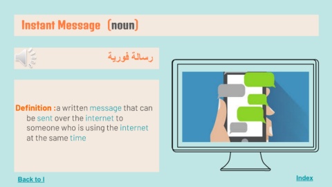 Instant Message (noun) Index رﺳﺎﻟﺔ ﻓﻮرﯾﺔ Definition :a written message that can be sent over the internet to someone who is using the internet at the same time Back to I