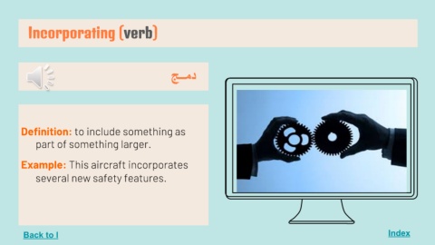 Incorporating (verb) Index دﻣــﺞ Definition: to include something as part of something larger. Example: This aircraft incorporates several new safety features. Back to I