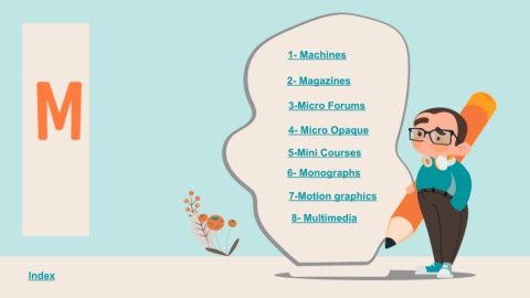M 1- Machines Index 2- Magazines 3-Micro Forums 4- Micro Opaque 5-Mini Courses 6- Monographs 7-Motion graphics 8- Multimedia