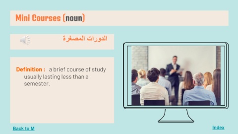 Mini Courses (noun) Index اﻟﺪورات اﻟﻤﺼﻐﺮة Definition : a brief course of study usually lasting less than a semester. Back to M