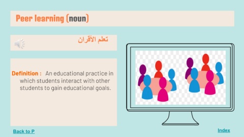 Peer learning (noun) Index ﺗﻌﻠﻢ اﻷﻗﺮان Definition : An educational practice in which students interact with other students to gain educational goals. Back to P