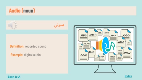 Audio (noun) ﺻﻮﺗﻲ Definition: recorded sound Example: digital audio Back to A Index