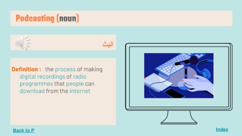 Podcasting (noun) Index اﻟﺒﺚ Definition : the process of making digital recordings of radio programmes that people can download from the internet Back to P