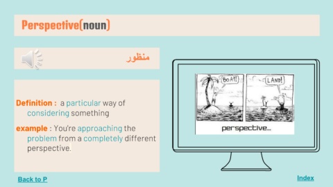 Perspective(noun) Index ﻣﻨﻈﻮر Definition : a particular way of considering something example : You're approaching the problem from a completely different perspective. Back to P