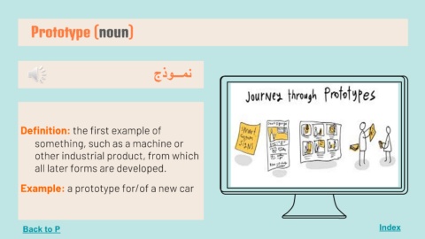 Prototype (noun) Index ﻧﻤـــﻮذج Definition: the first example of something, such as a machine or other industrial product, from which all later forms are developed. Example: a prototype for/of a new car Back to P