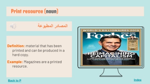 Print resource (noun) Index اﻟﻤﺼﺎدر اﻟﻤﻄﺒﻮﻋﺔ Definition: material that has been printed and can be produced in a hard copy. Example: Magazines are a printed resource. Back to P