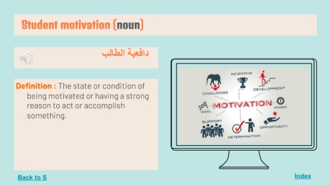 Student motivation (noun) Index داﻓﻌﯿﺔ اﻟﻄﺎﻟﺐ Definition : The state or condition of being motivated or having a strong reason to act or accomplish something. Back to S