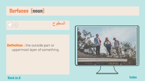 Surfaces (noun) Index اﻟﺴﻄﻮح Definition : the outside part or uppermost layer of something. Back to S