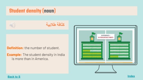 Student density (noun) Index ﻛﺜﺎﻓﺔ طﻼﺑﯿﺔ Definition: the number of student. Example: The student density in India is more than in America. Back to S