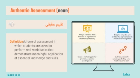 Authentic Assessment (noun) Index ﺗﻘﯿﯿﻢ ﺣﻘﯿﻘﻲ Definition:A form of assessment in which students are asked to perform real-world tasks that demonstrate meaningful application of essential knowledge and skills. Back to A