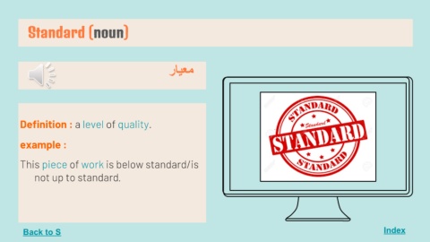 Standard (noun) ﻣﻌﯿﺎر Definition : a level of quality. example : This piece of work is below standard/is not up to standard. Back to S Index